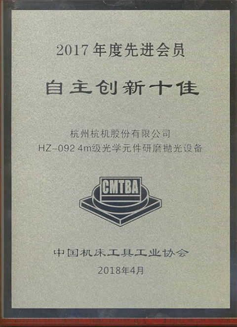 2018年4月,中國機床工具工業(yè)協(xié)會開展了2017年度中國機床工具工業(yè)協(xié)會先進會員(十佳)表彰活動,我公司憑借“HZ-092 4米級光學元件研磨拋光設(shè)備”項目榮獲2017年度中國機床工具工業(yè)協(xié)會“自主創(chuàng)新十佳”稱號。